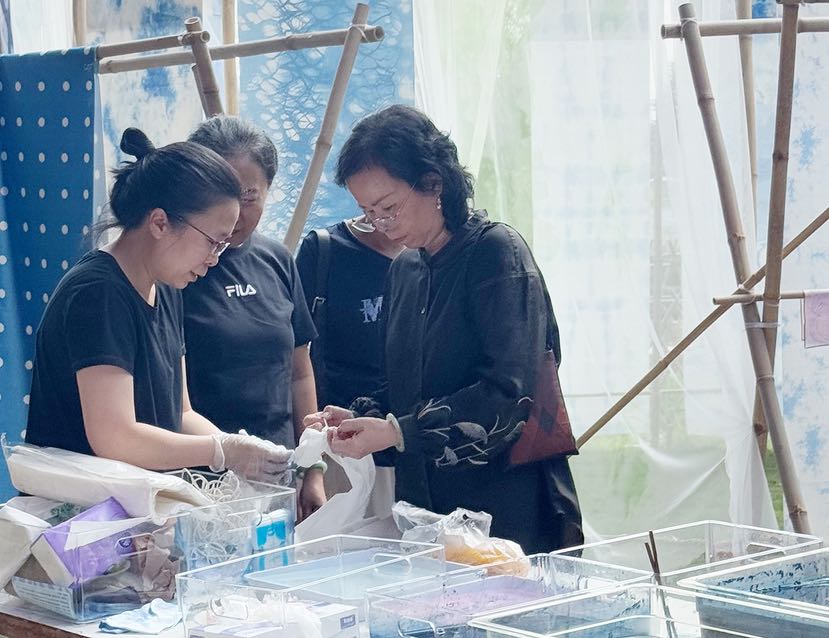 隨后,一場親手制作的體驗環節將活動推向高潮。在工匠師傅的指導下,游客們紛紛動手,嘗試染整工藝。他們發揮創意,用棉線、夾子在素白絲巾上纏繞、捆扎,再浸入天然染料中,驚喜與成就感洋溢在每個人的臉上。
